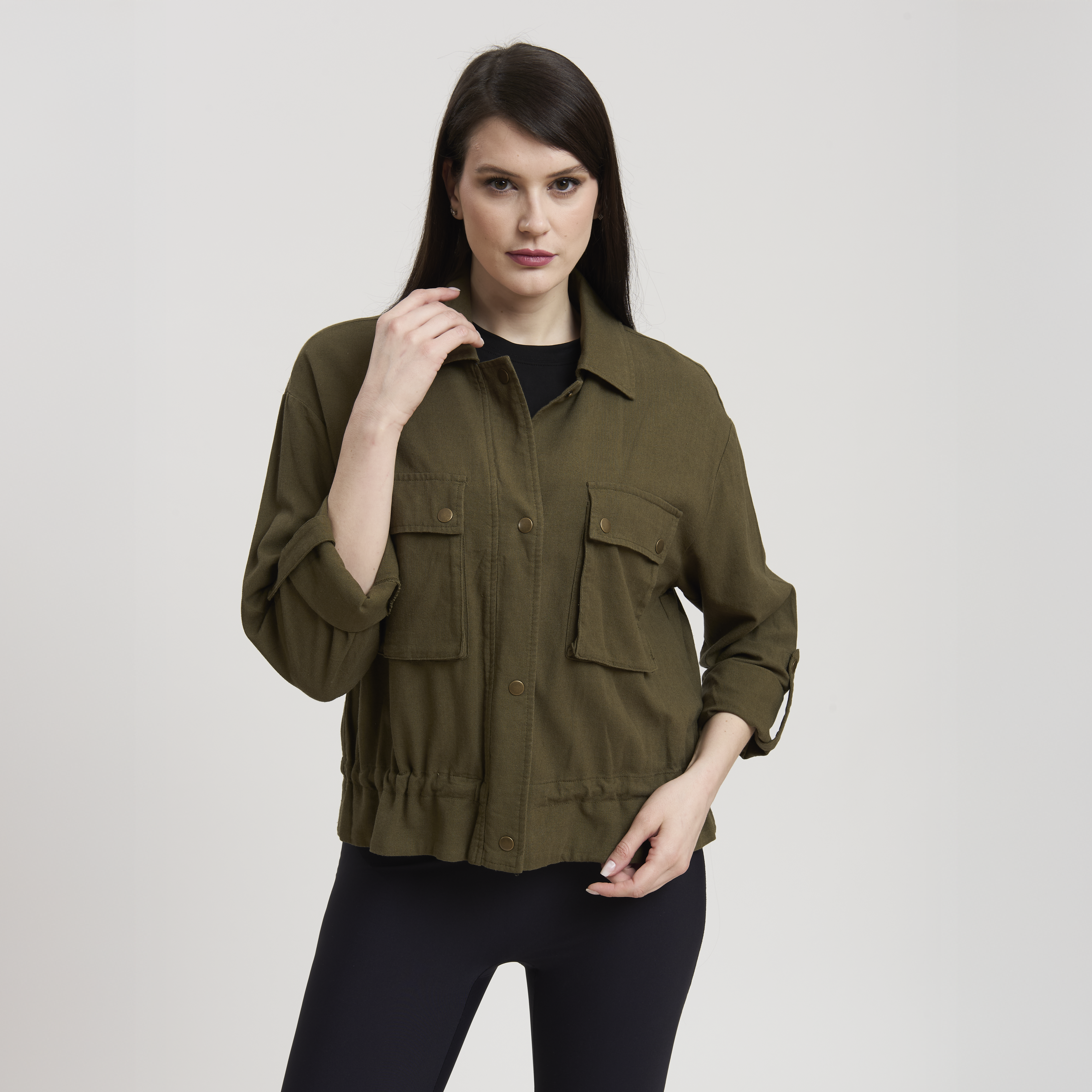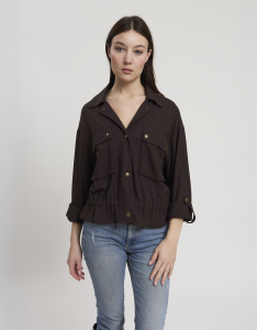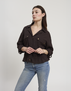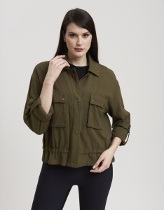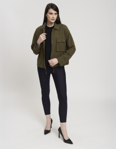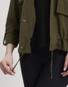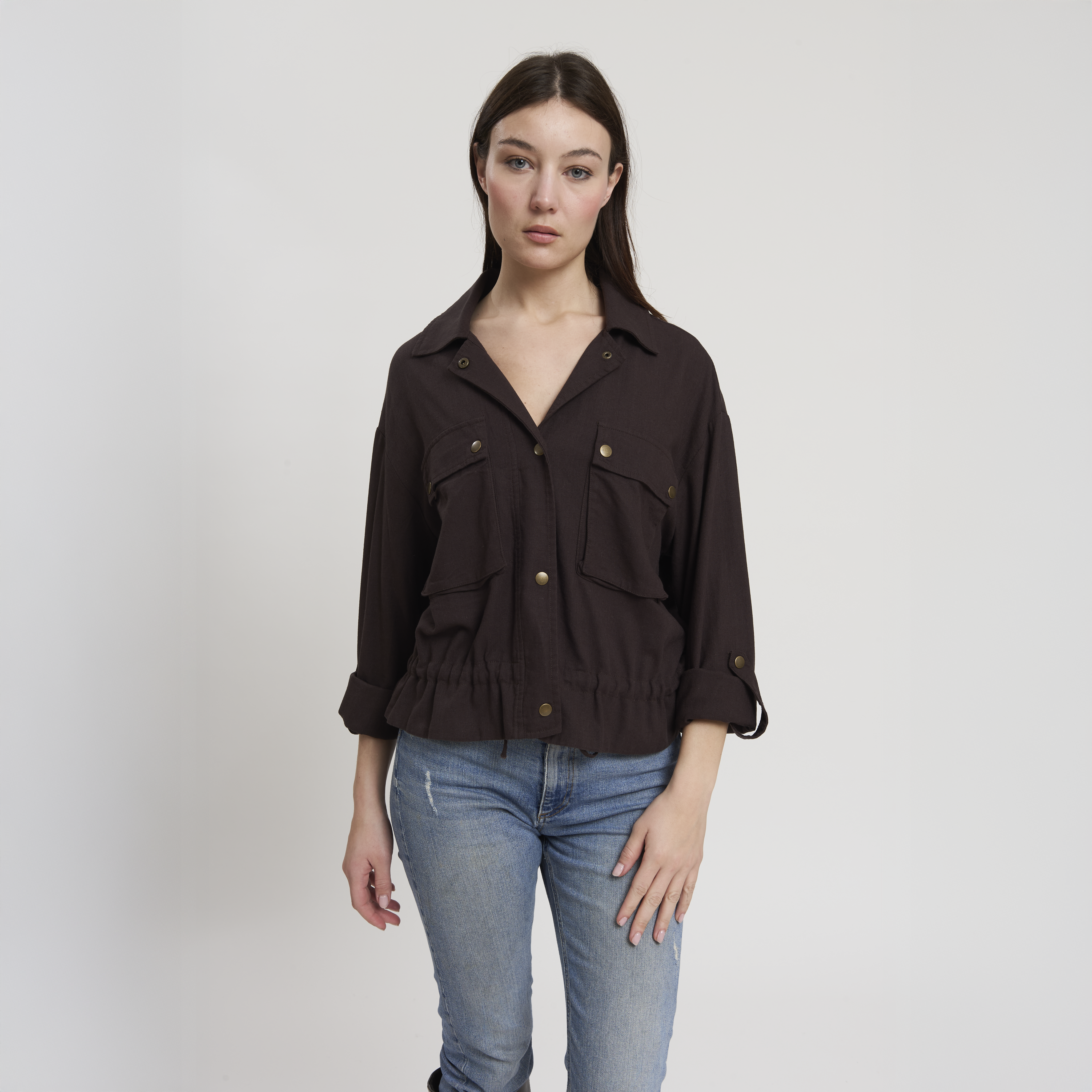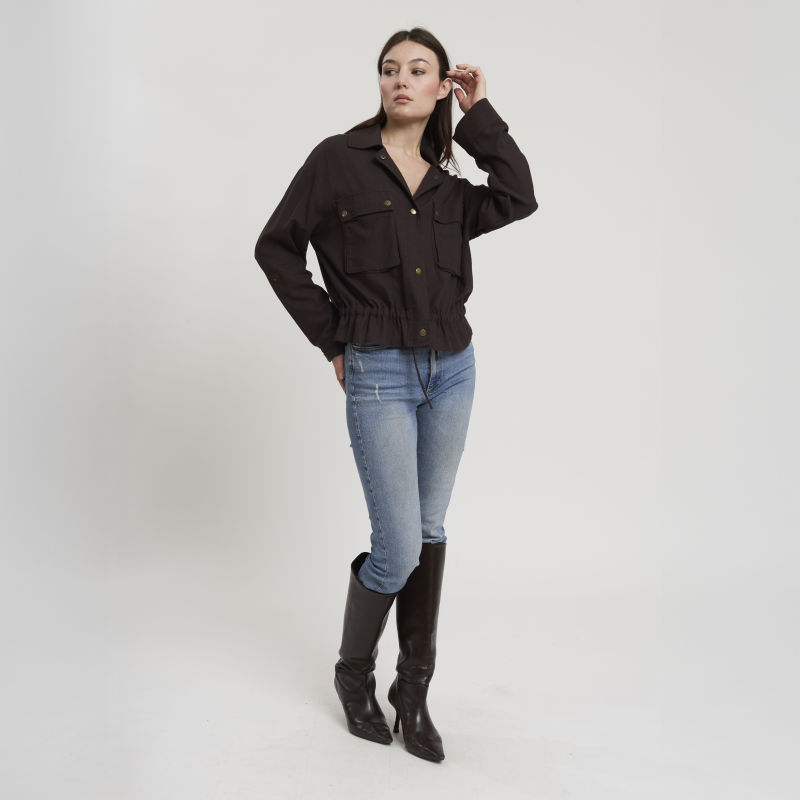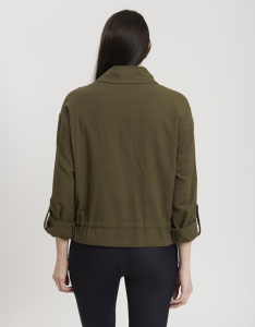 • Concept: Giacca corta in misto lino con chiusura a bottoni a pressione.