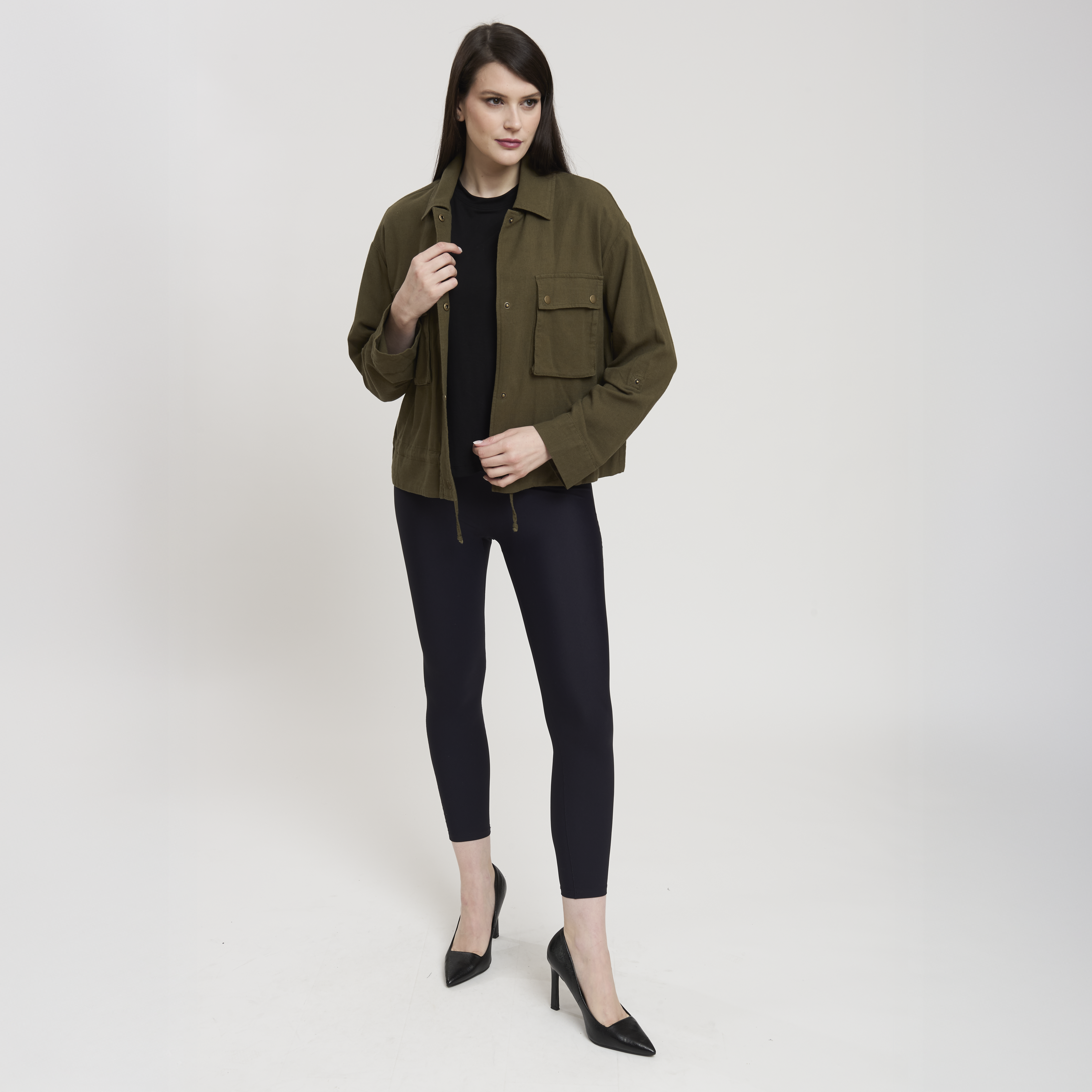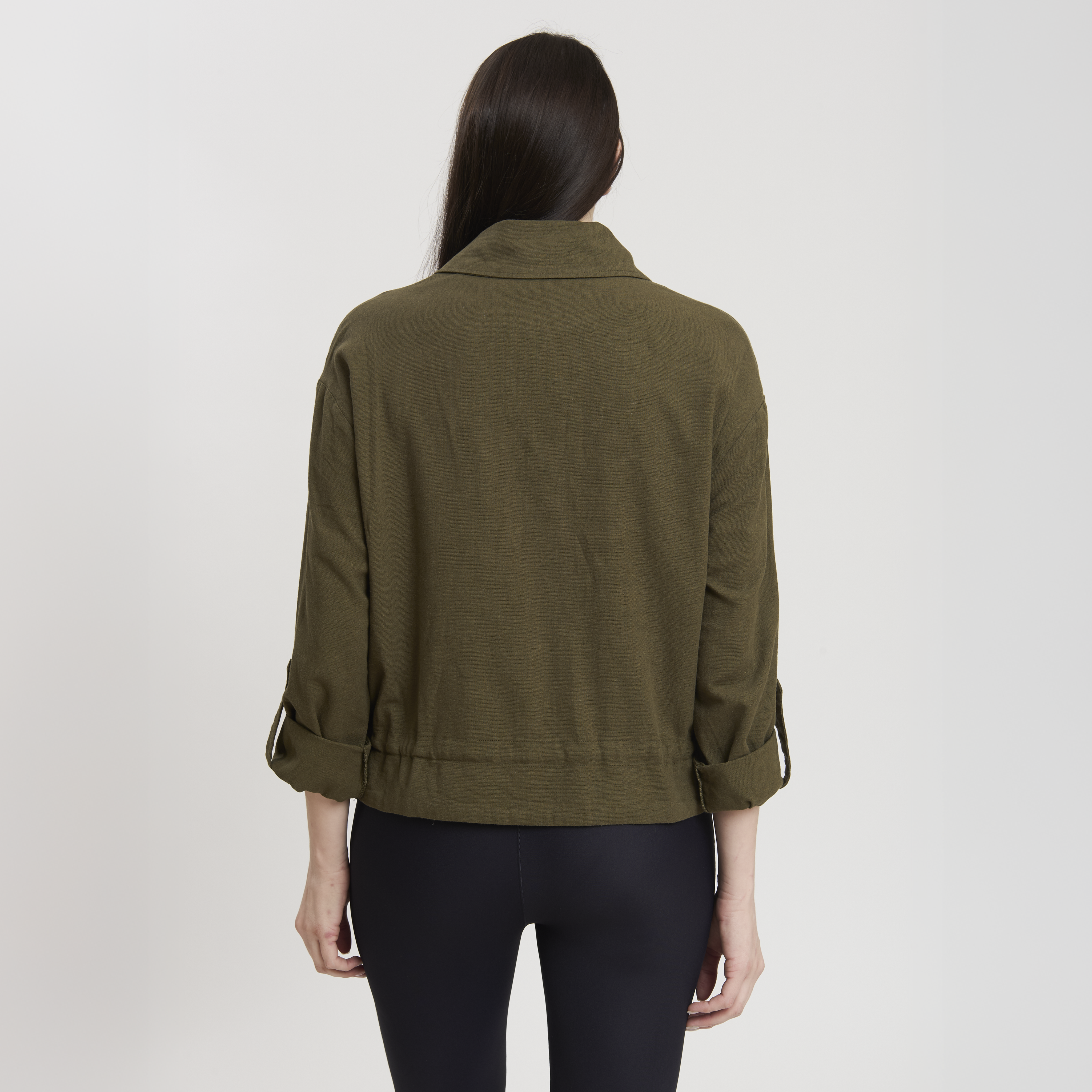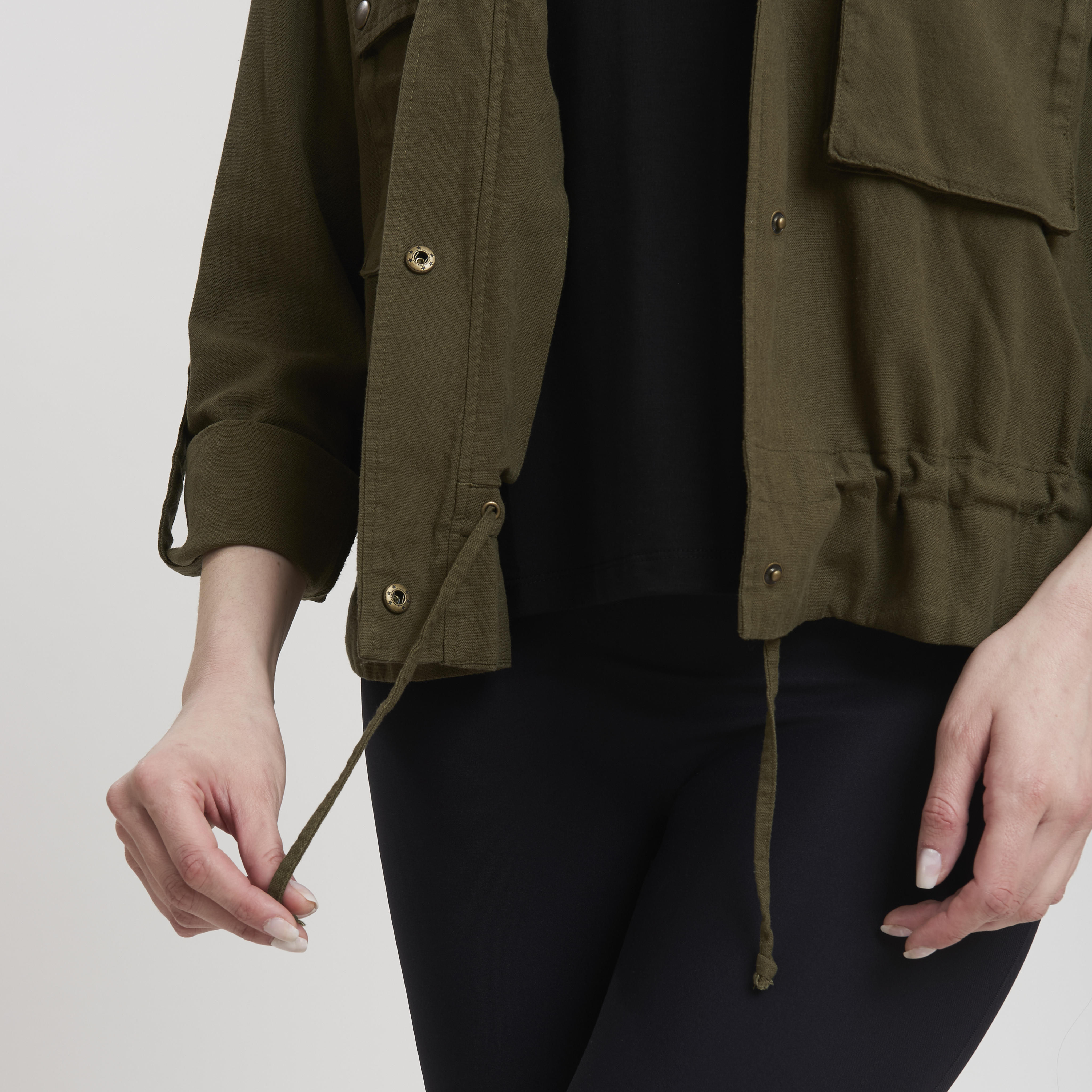 • Concept: Giacca corta in misto lino con chiusura a bottoni a pressione.