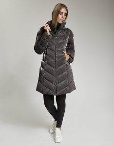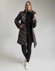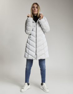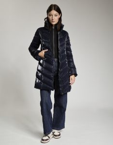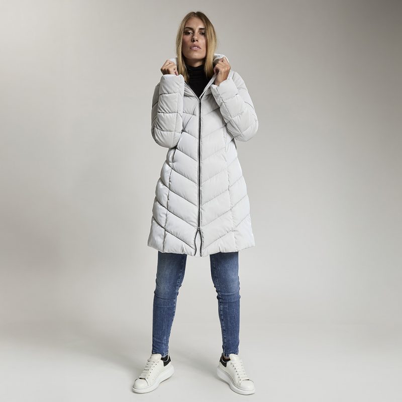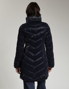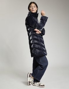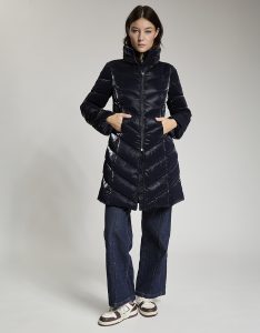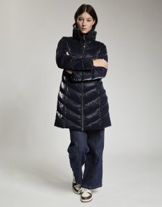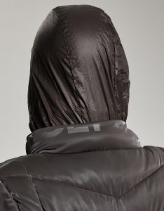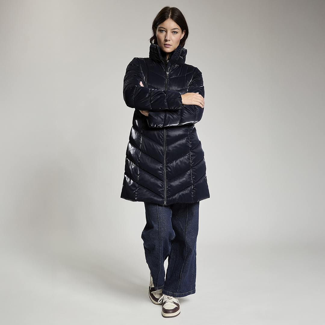Giacca lunga imbottita con cappuccio di fortuna inserito nel collo. Tessuto crepe effetto velluto lucido. Water repellent.