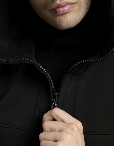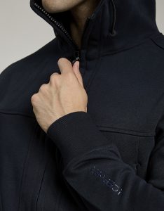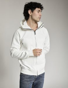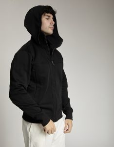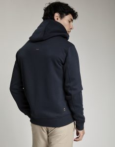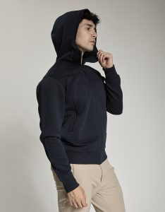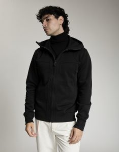 Felpa full zip con cappuccio. Tessuto tecnico bifrontura ed esterno in cotone.
