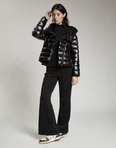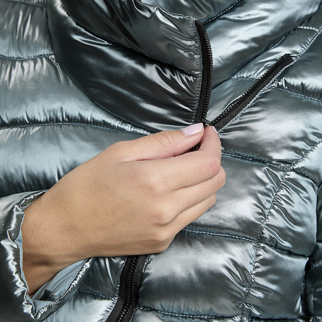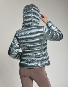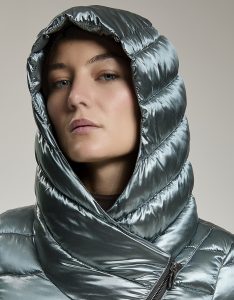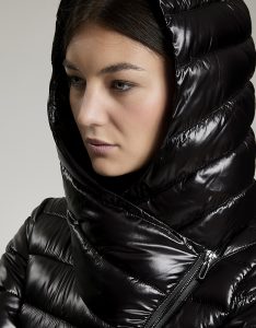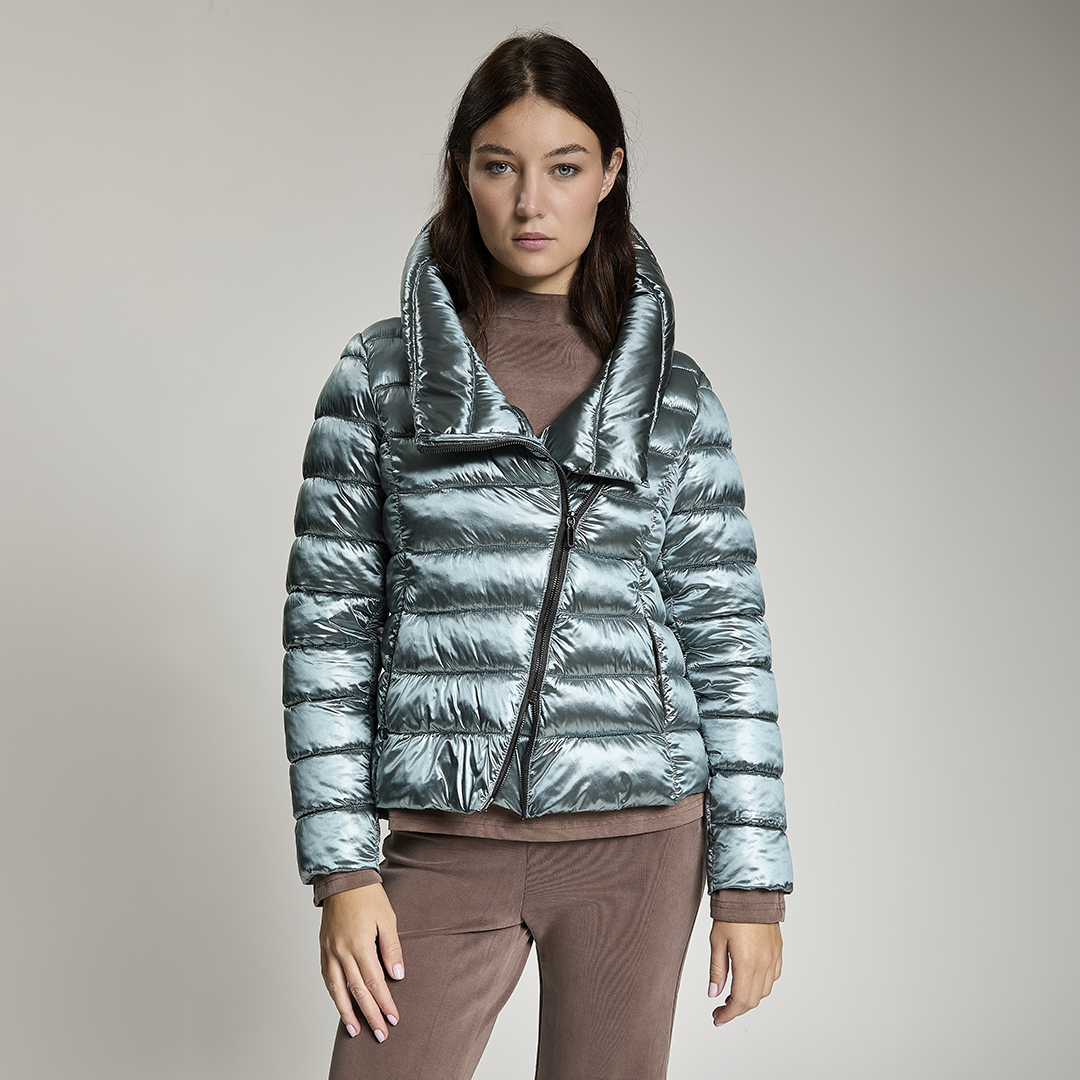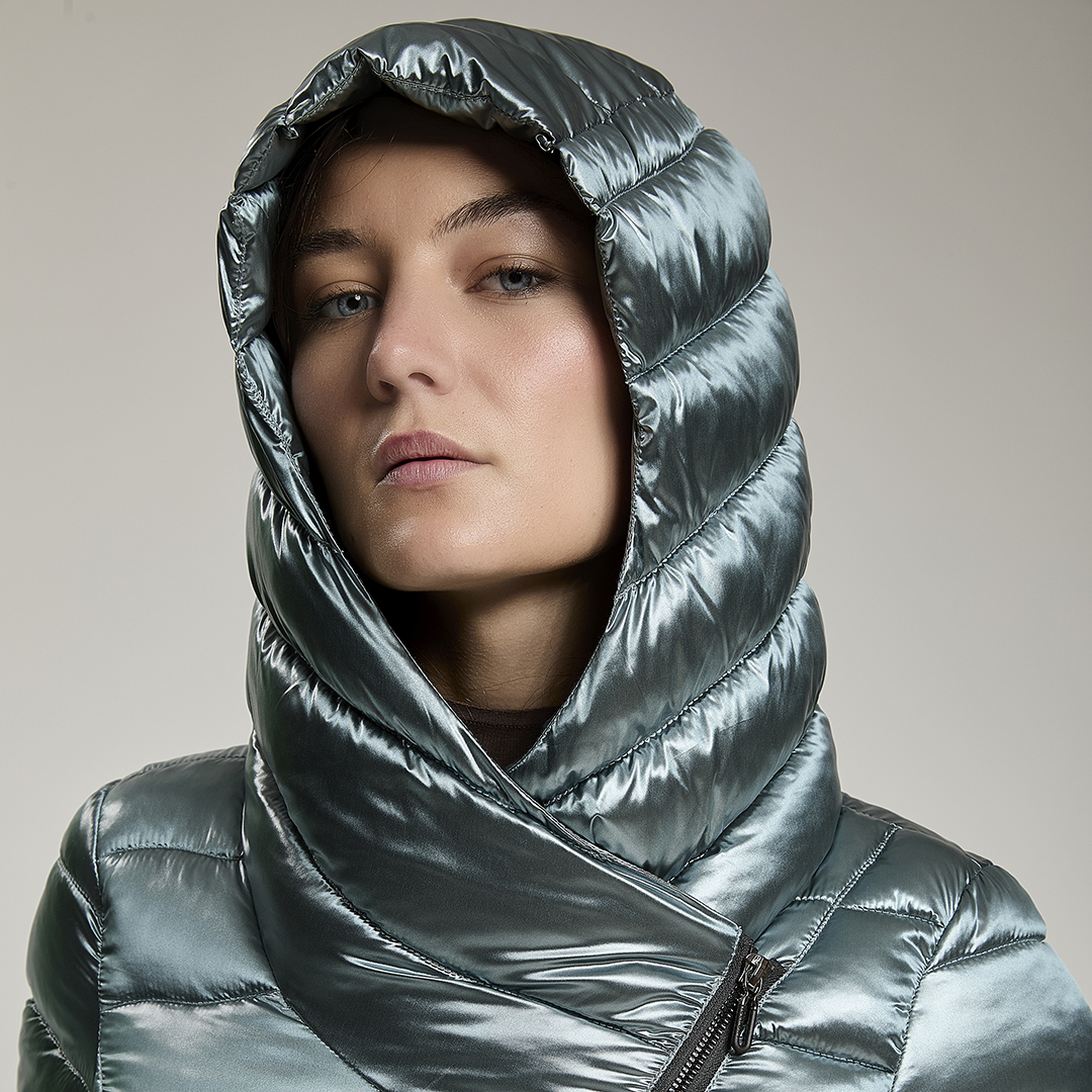 Giacca leggera trapuntata con apertura obliqua. Zip centrale con doppio cursore che arriva a chiudersi sulla spalla per dare vita ad un ampio cappuccio. Water repellant.