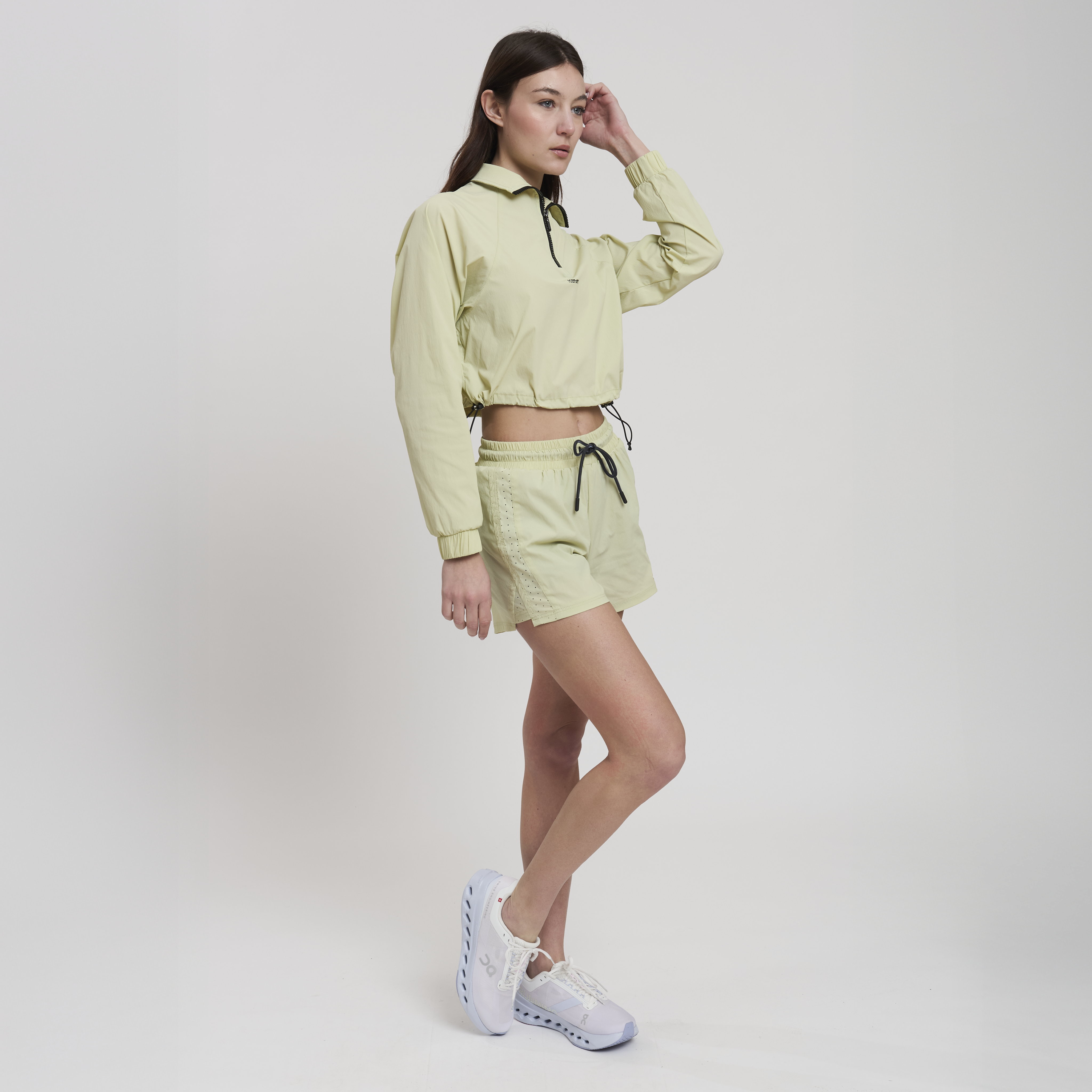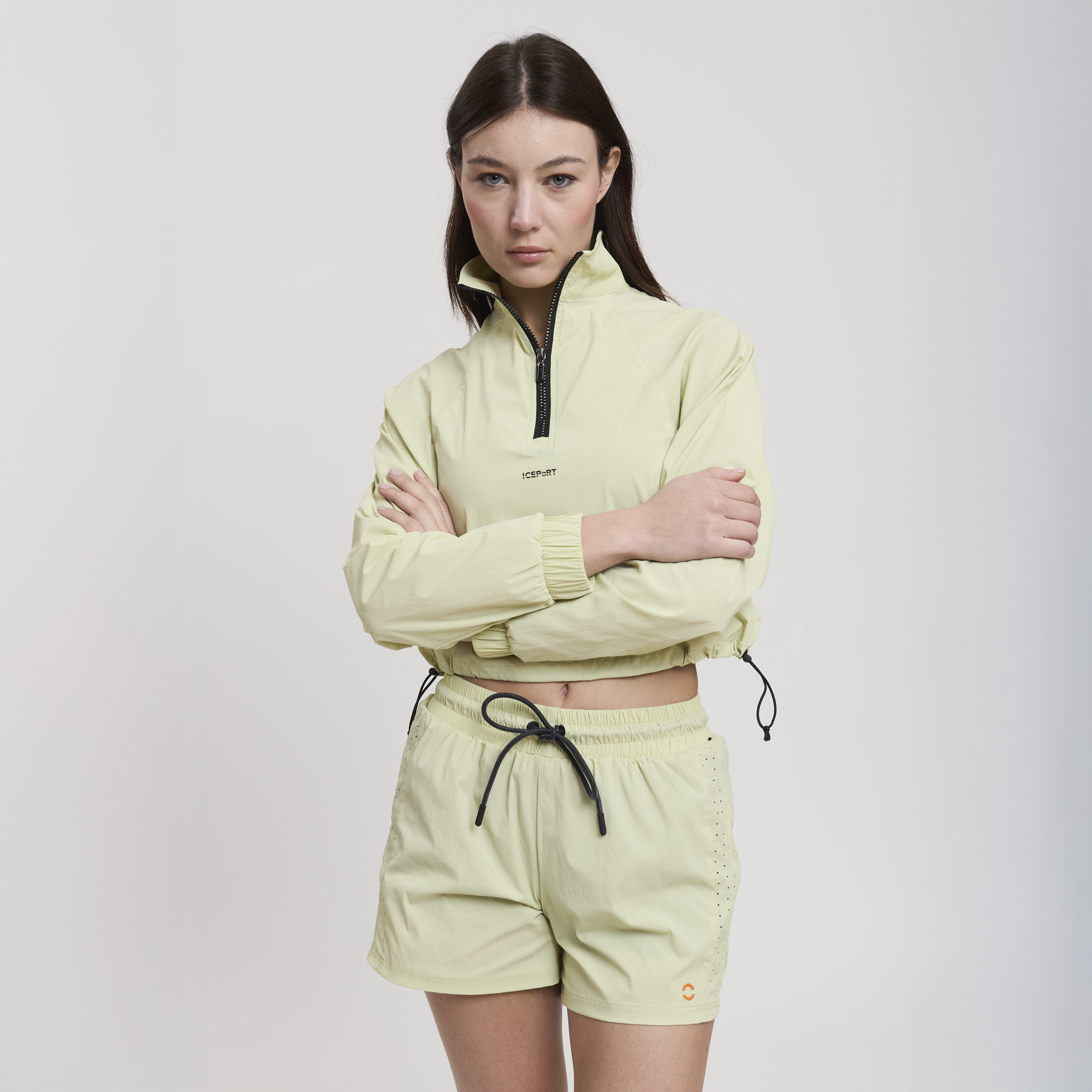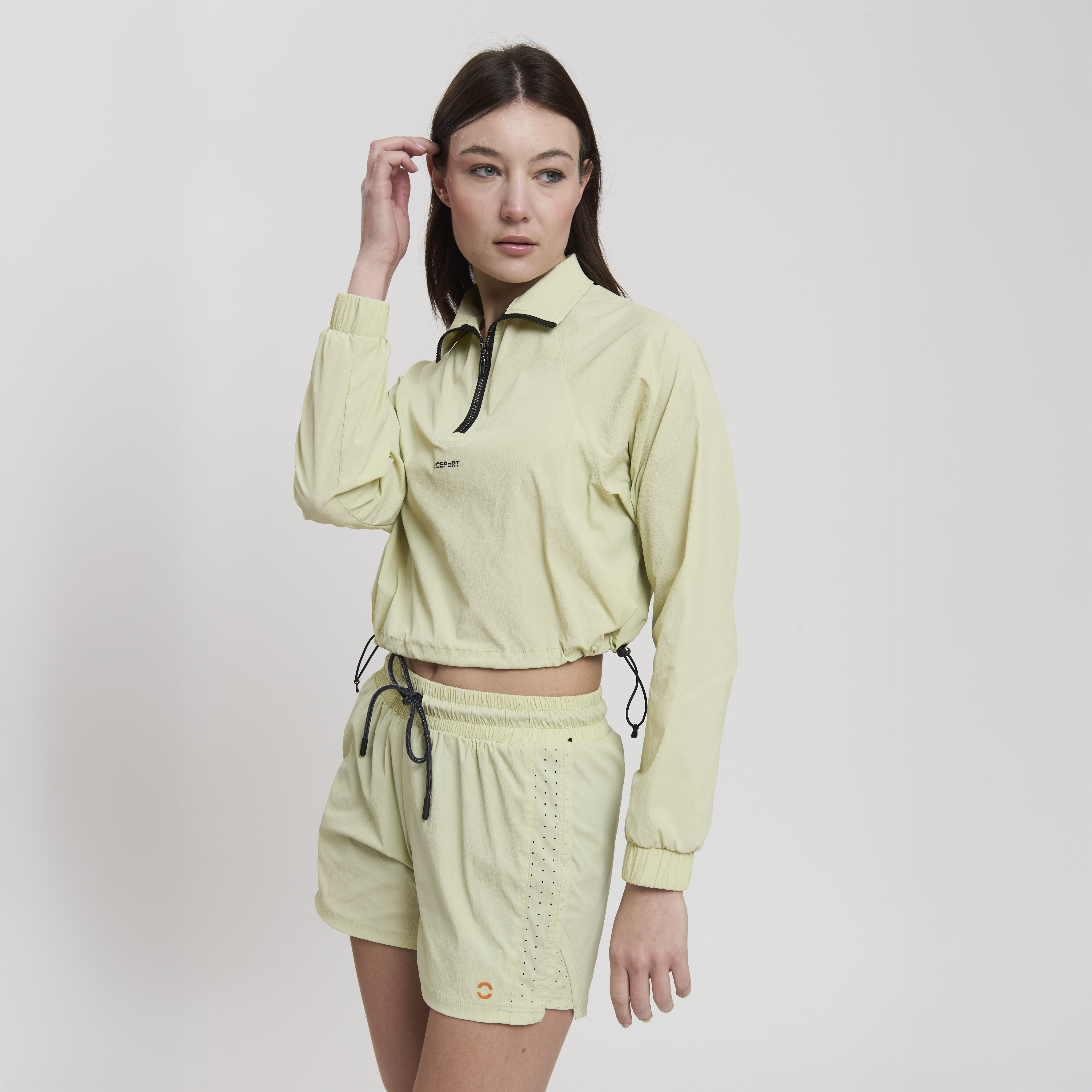 • Concept: Giacca cropped sportiva con zip apribile a ¾. Fondo regolabile con doppia coulisse. Zip con logo in rilevo.