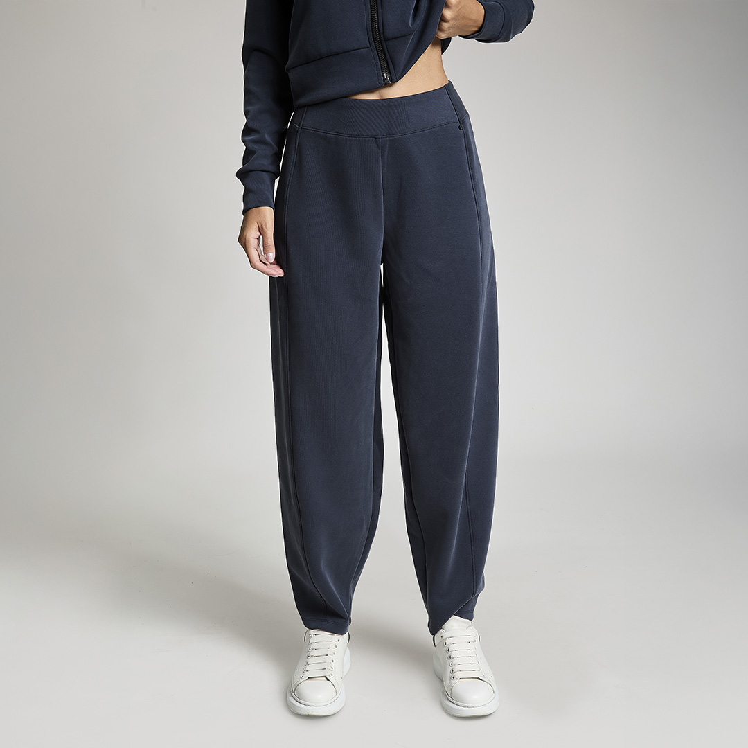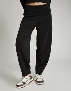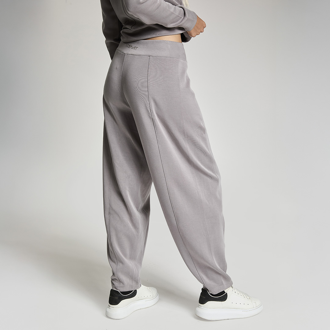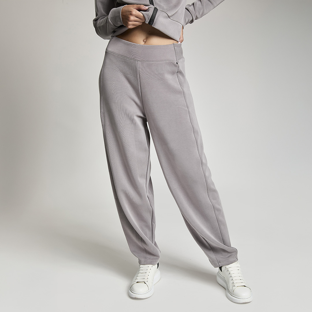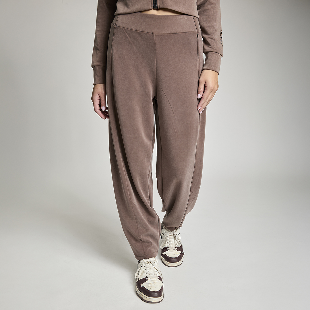 Pantalone baloon con vita gommata all' interno antiscivolo. Tessuto in felpa. Tessuto in felpa tecnica. Tessuto in felpa tecnica “wear a hug”. Morbidi soffice e leggero.