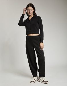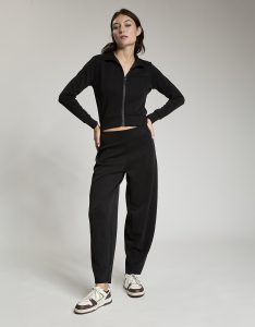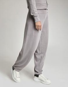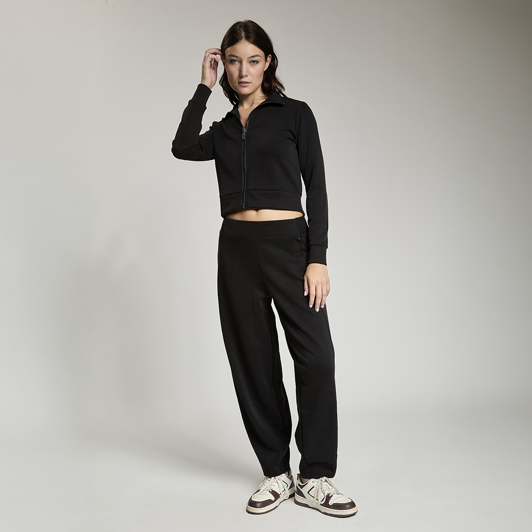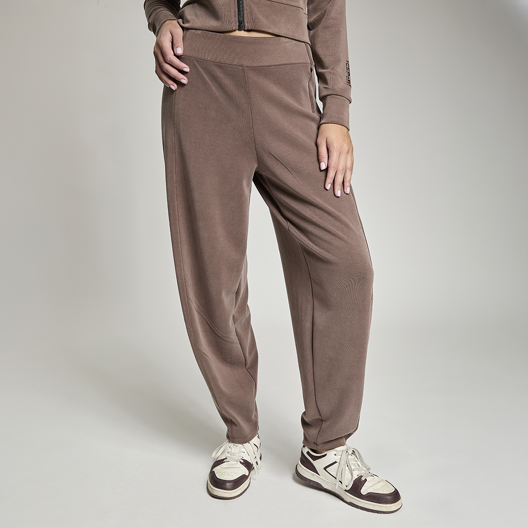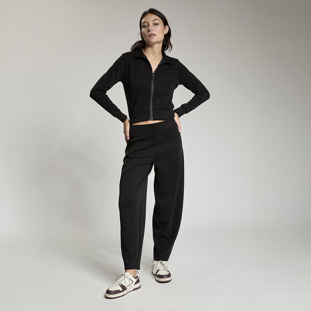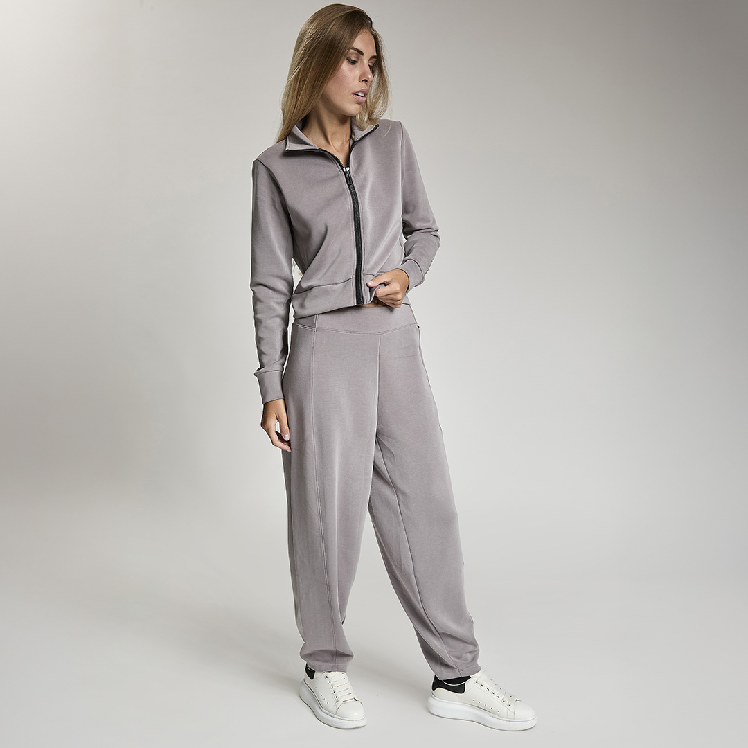 Pantalone baloon con vita gommata all' interno antiscivolo. Tessuto in felpa. Tessuto in felpa tecnica. Tessuto in felpa tecnica “wear a hug”. Morbidi soffice e leggero.