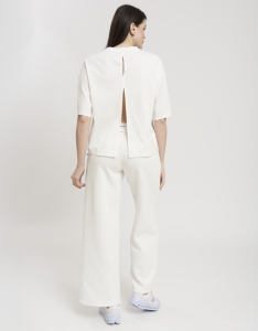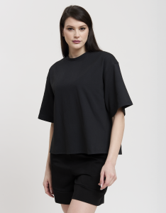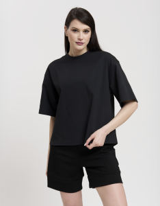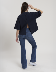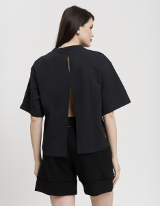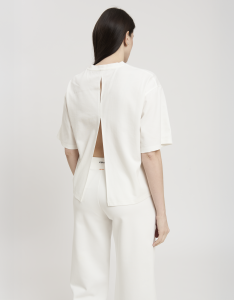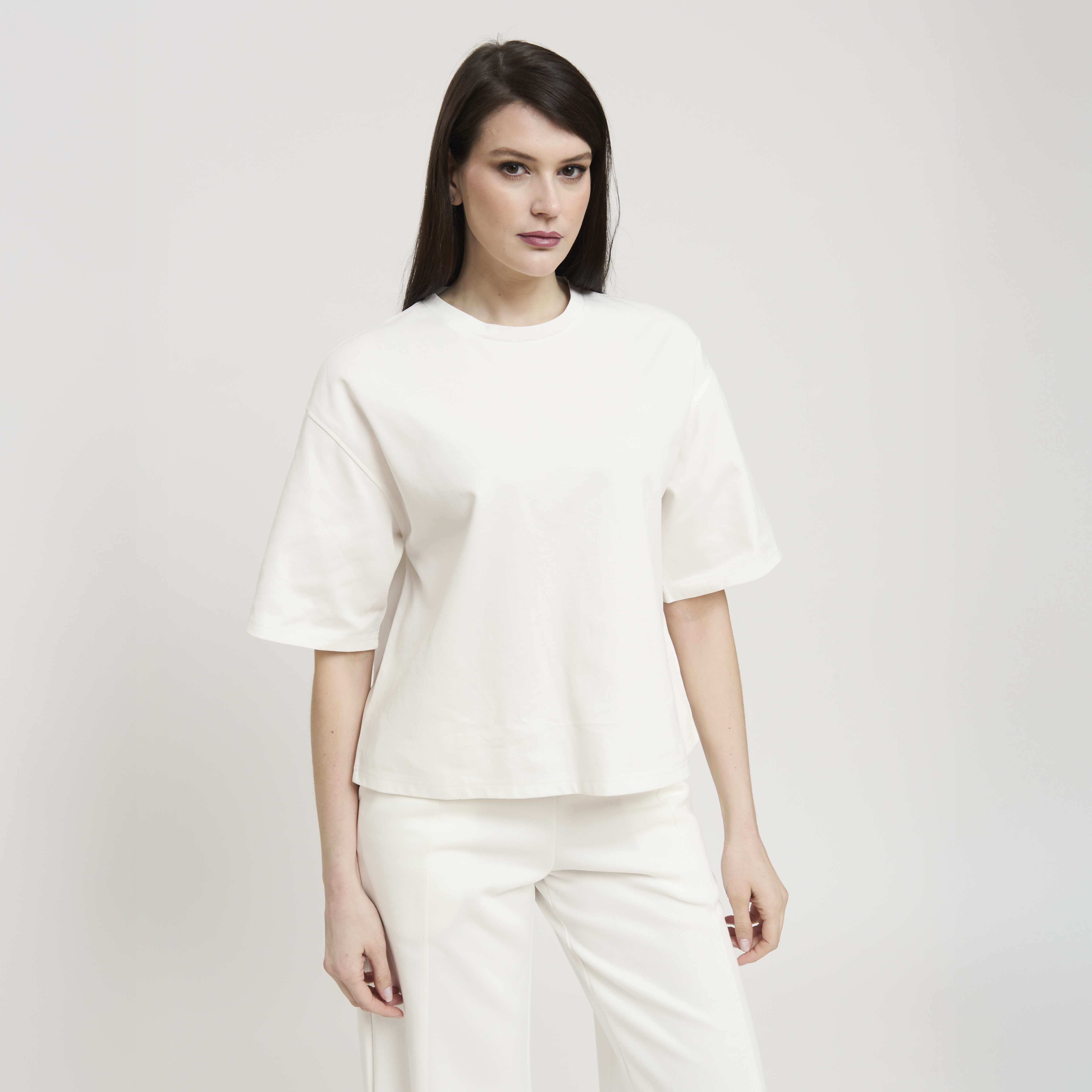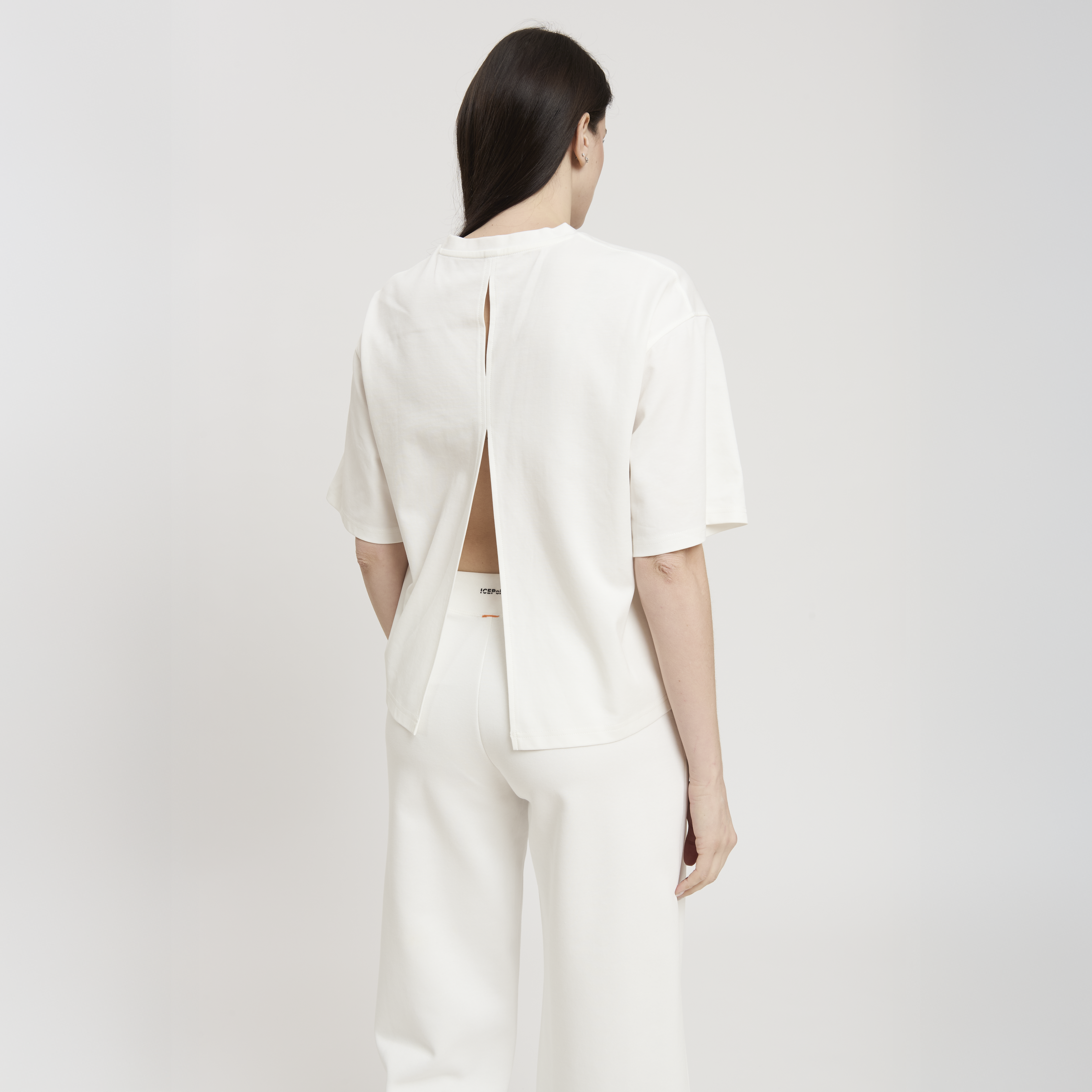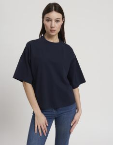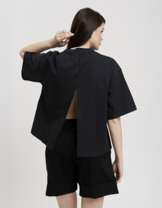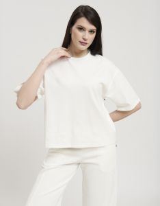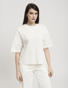 • Concept: T-Shirt dal taglio rilassato. Manica al gomito. Piccola apertura sulla schiena in alto e spacco sul fondo