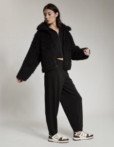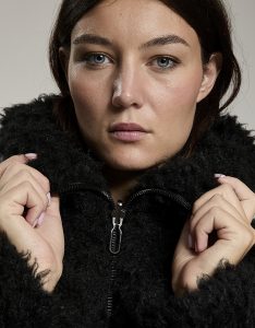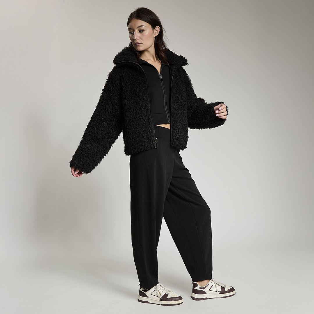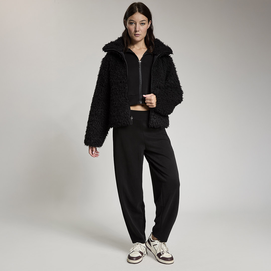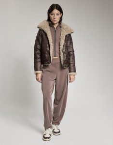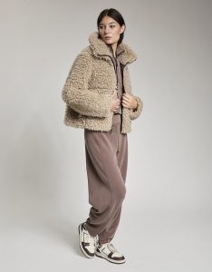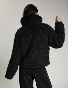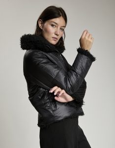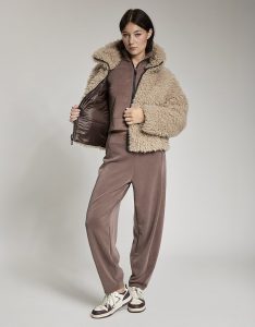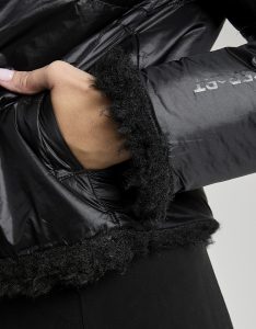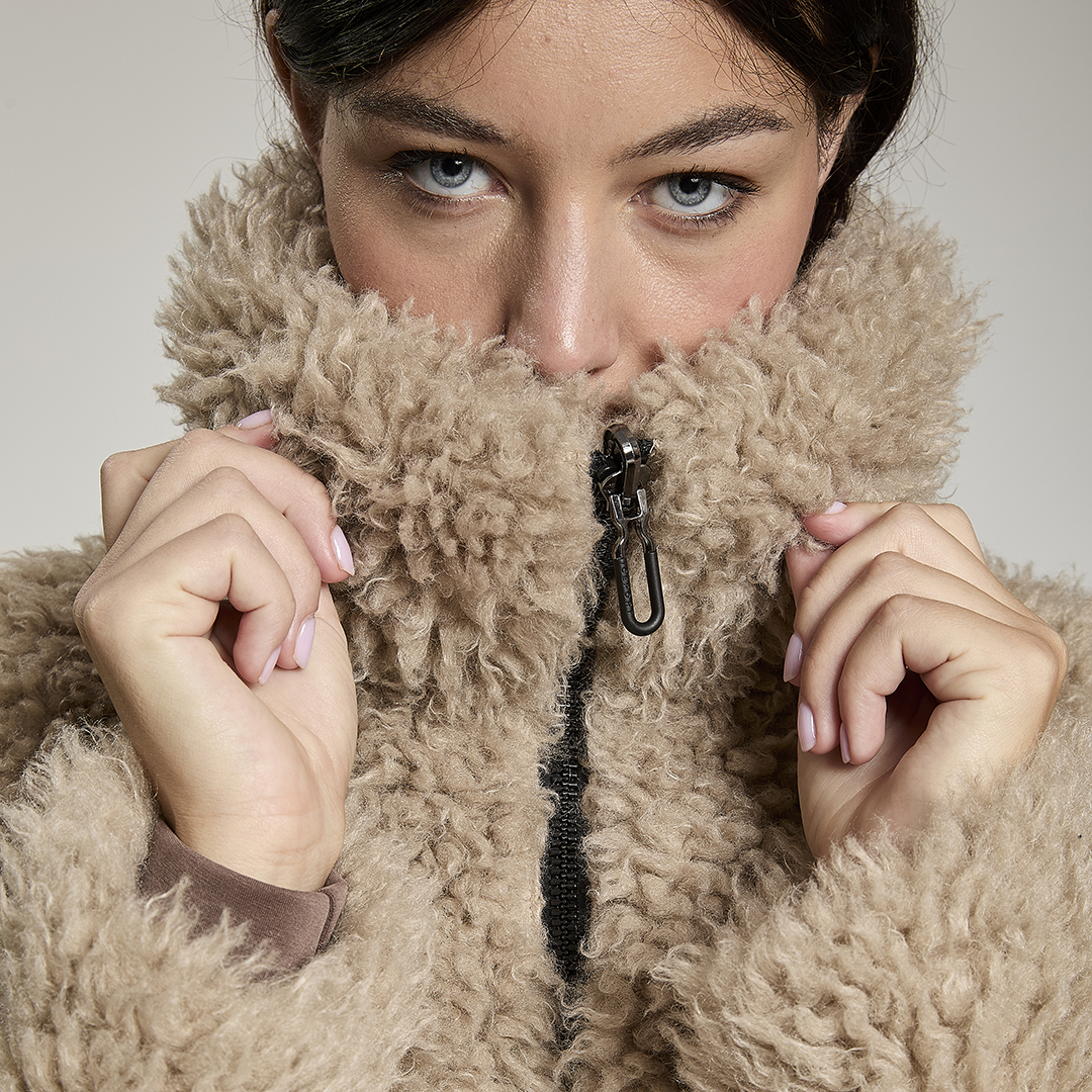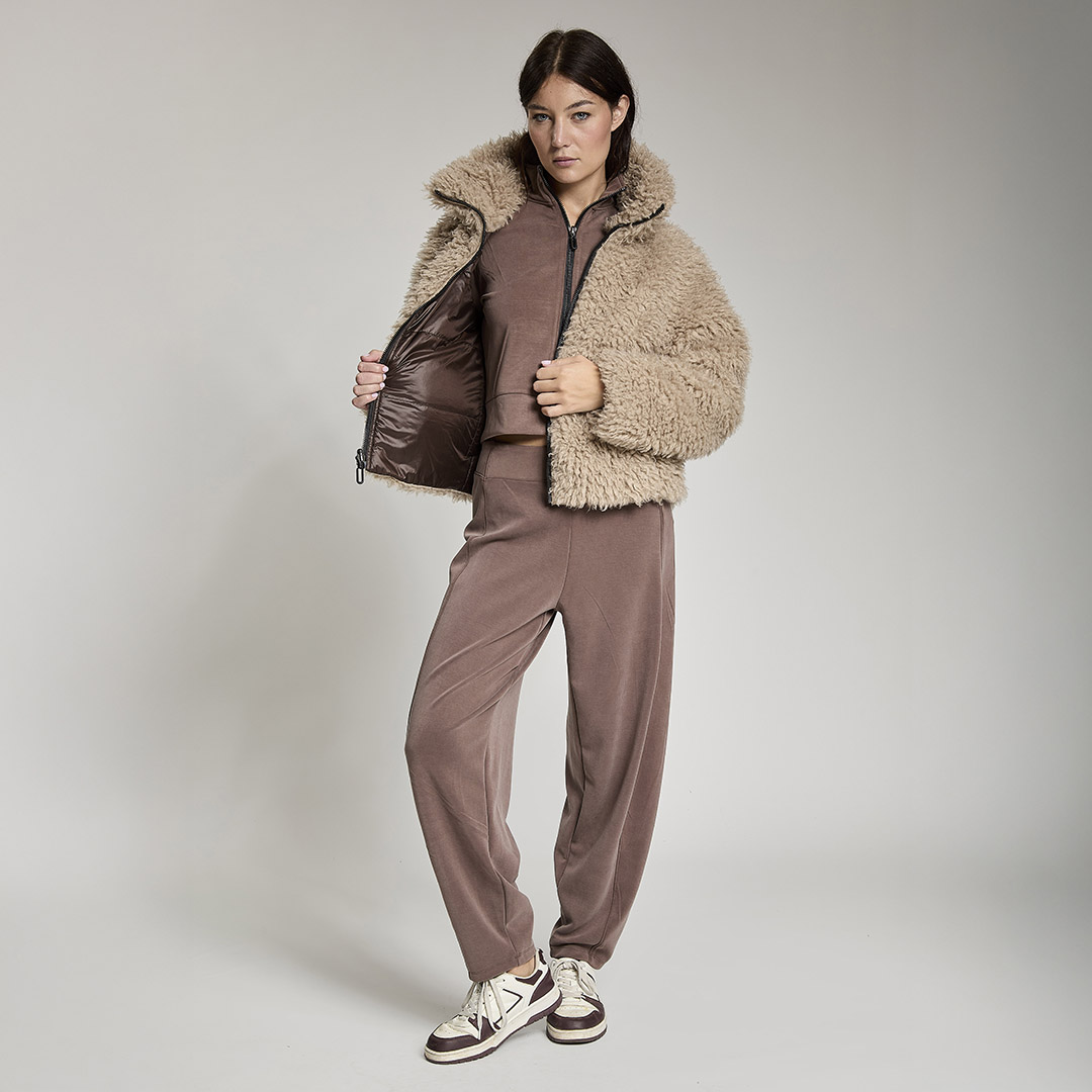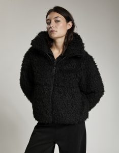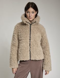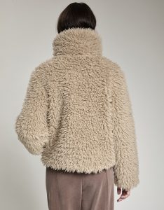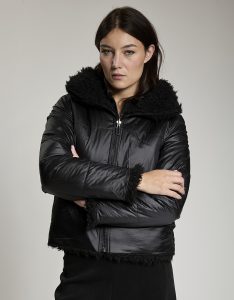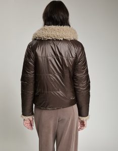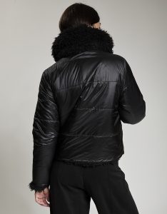 Giacca reversibile con collo alto. Un lato è realizzato in ecoshearling l'altro in nylon shimmer. Water repellant.