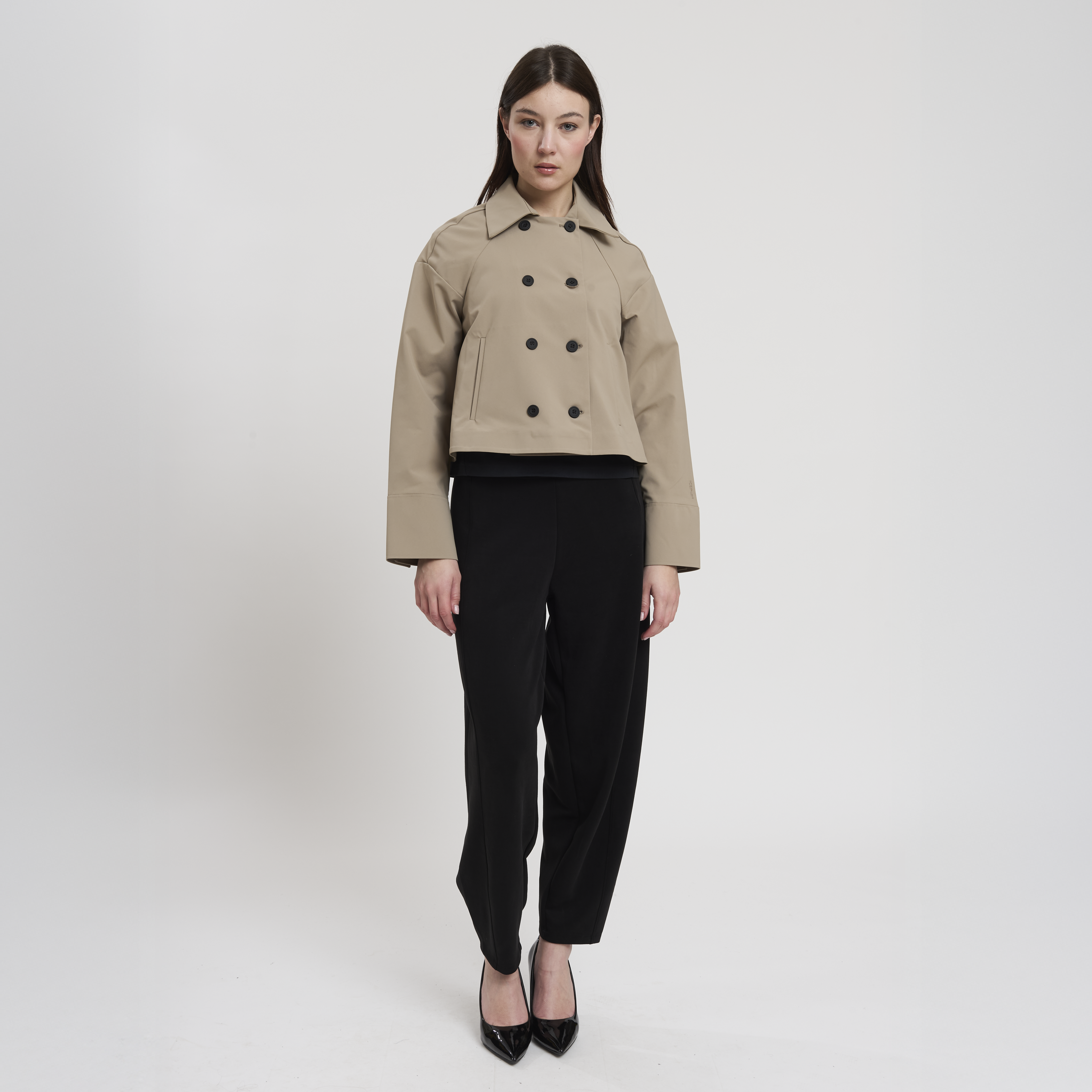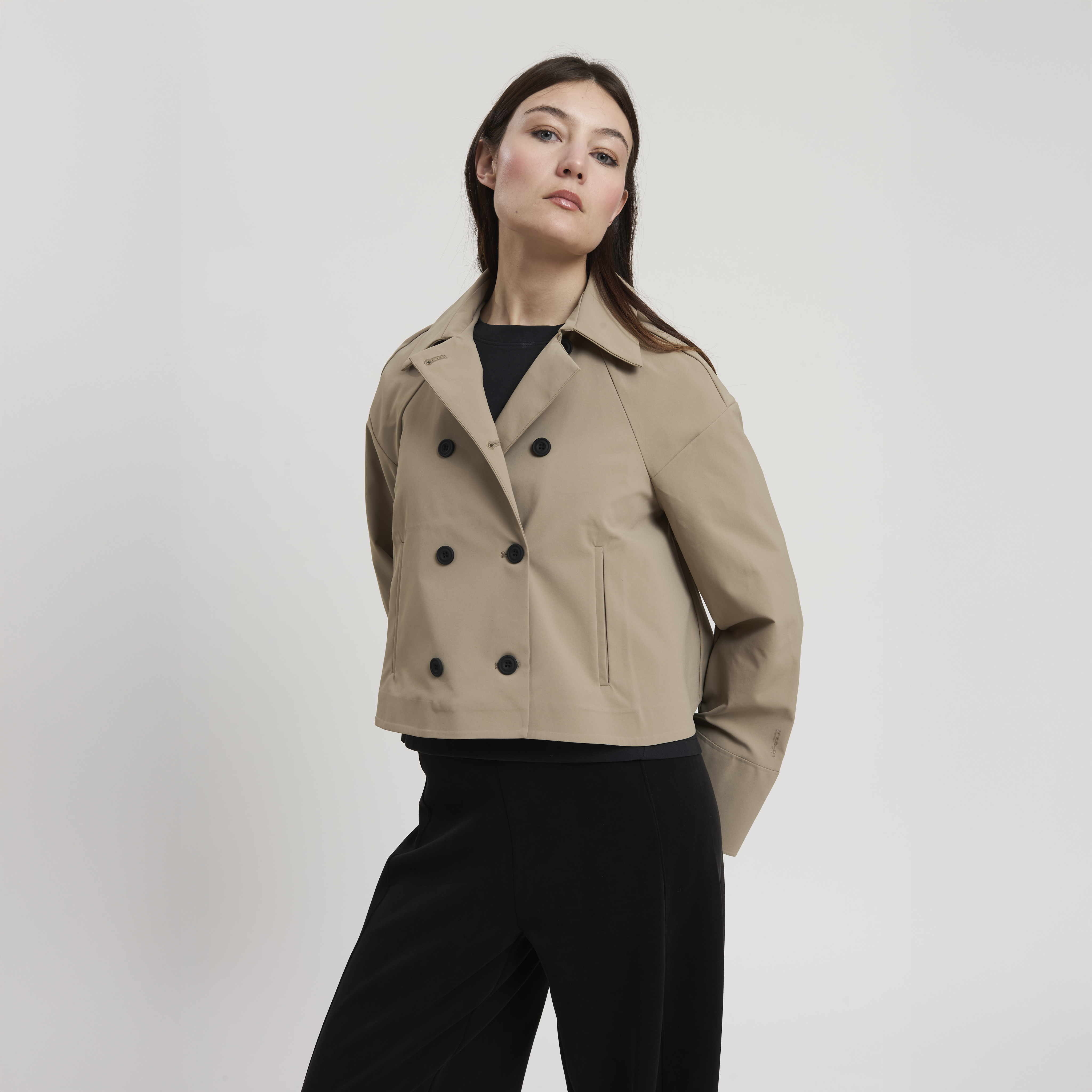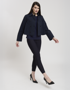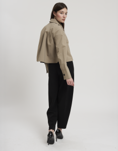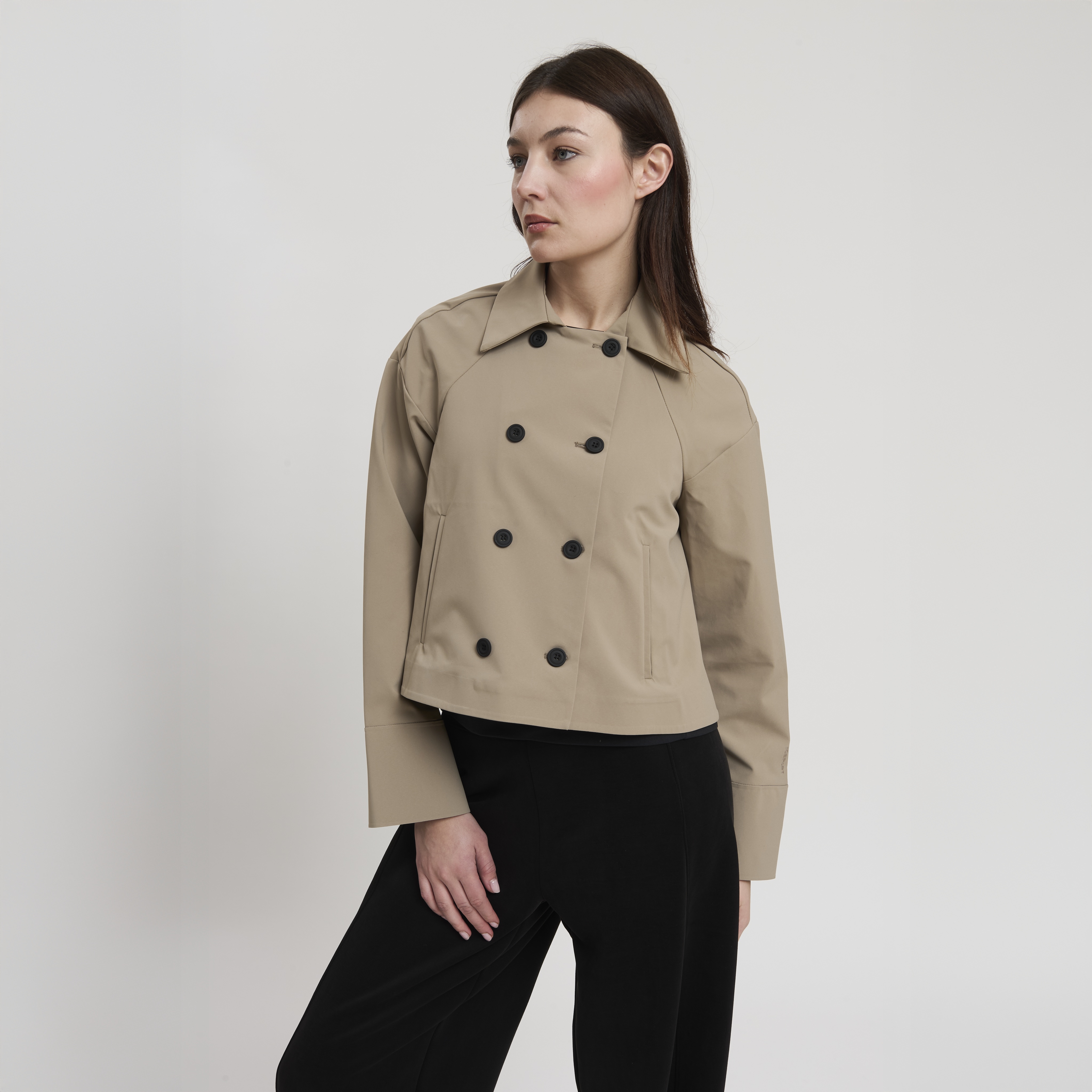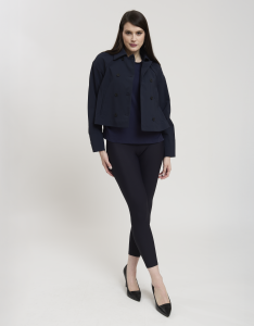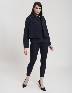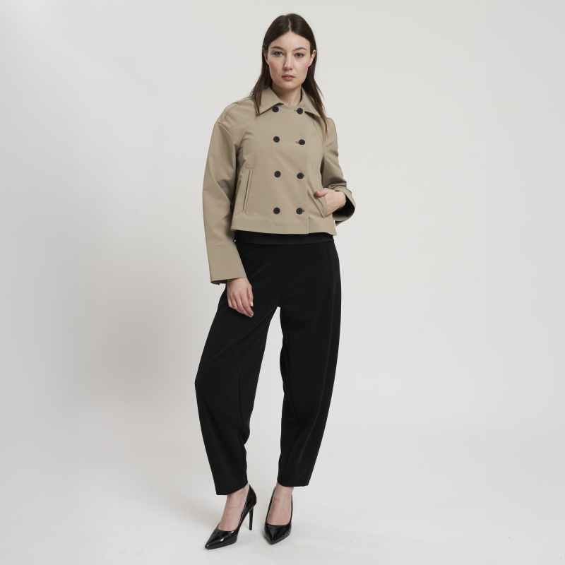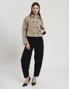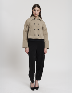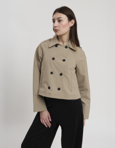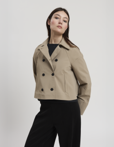 • Concept: Trench corto con collo a revers e maniche rifinite con polsino. Tasche sul davanti. Dettagli di pinces sul retro. Chiusura doppiopetto con bottoni gommati.