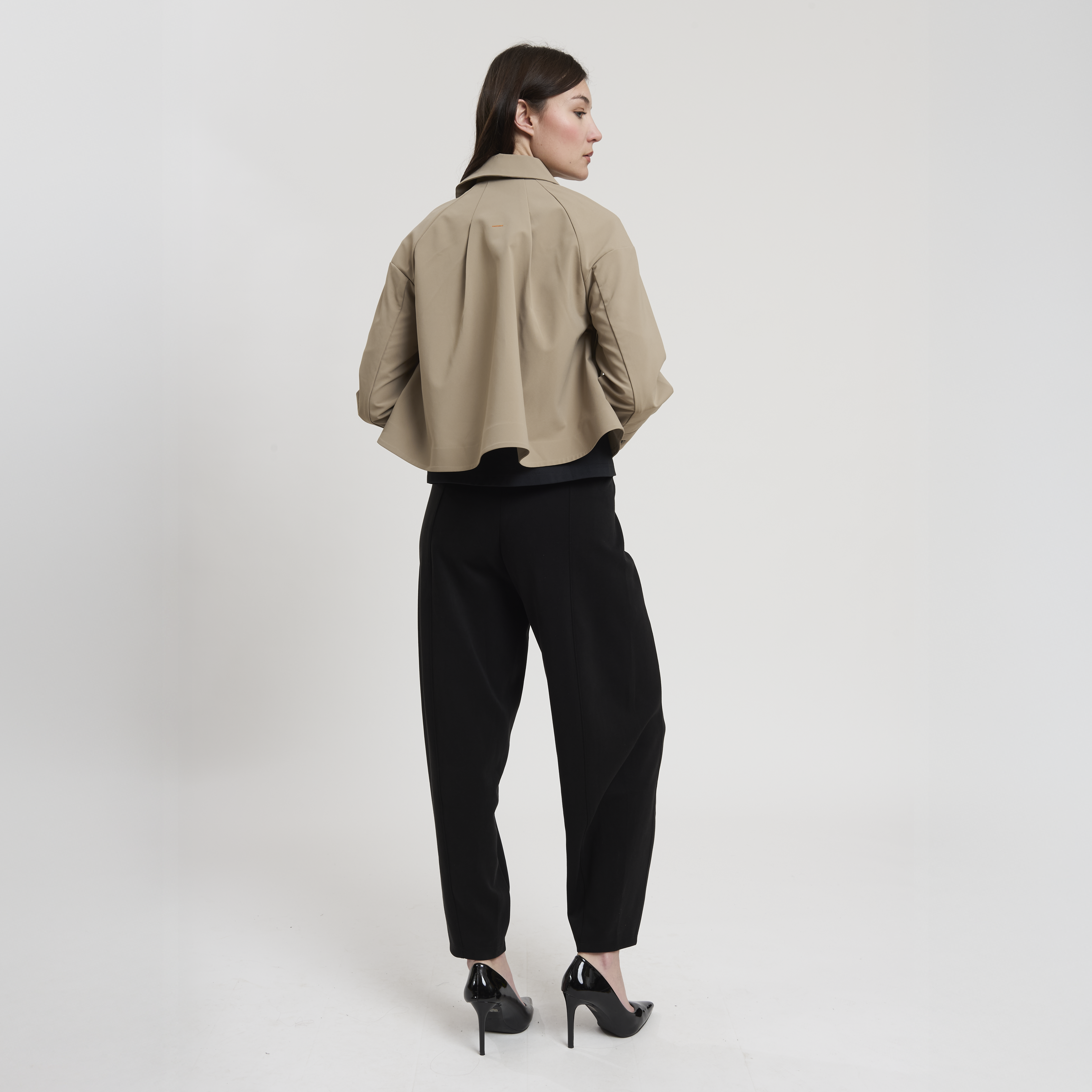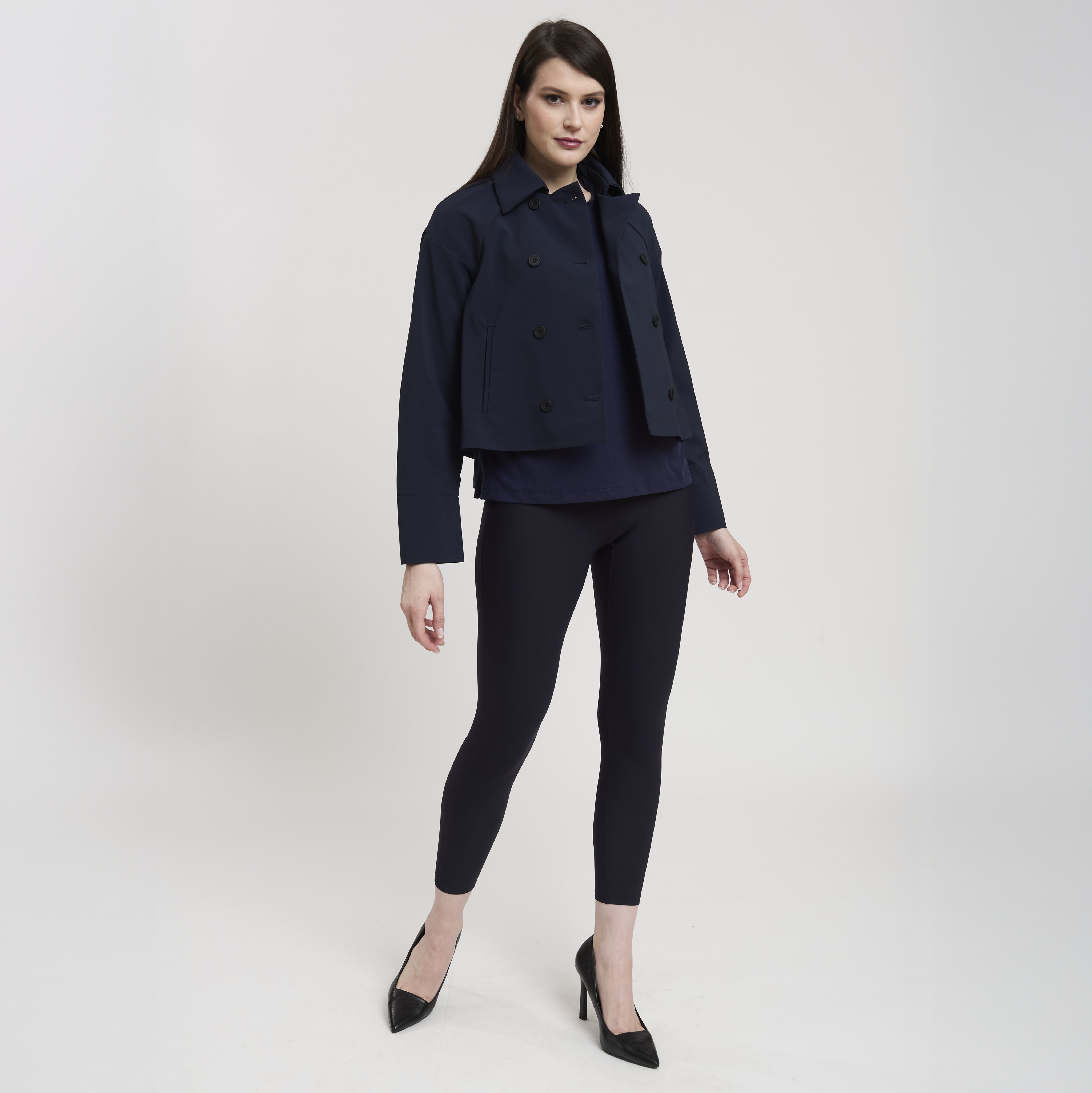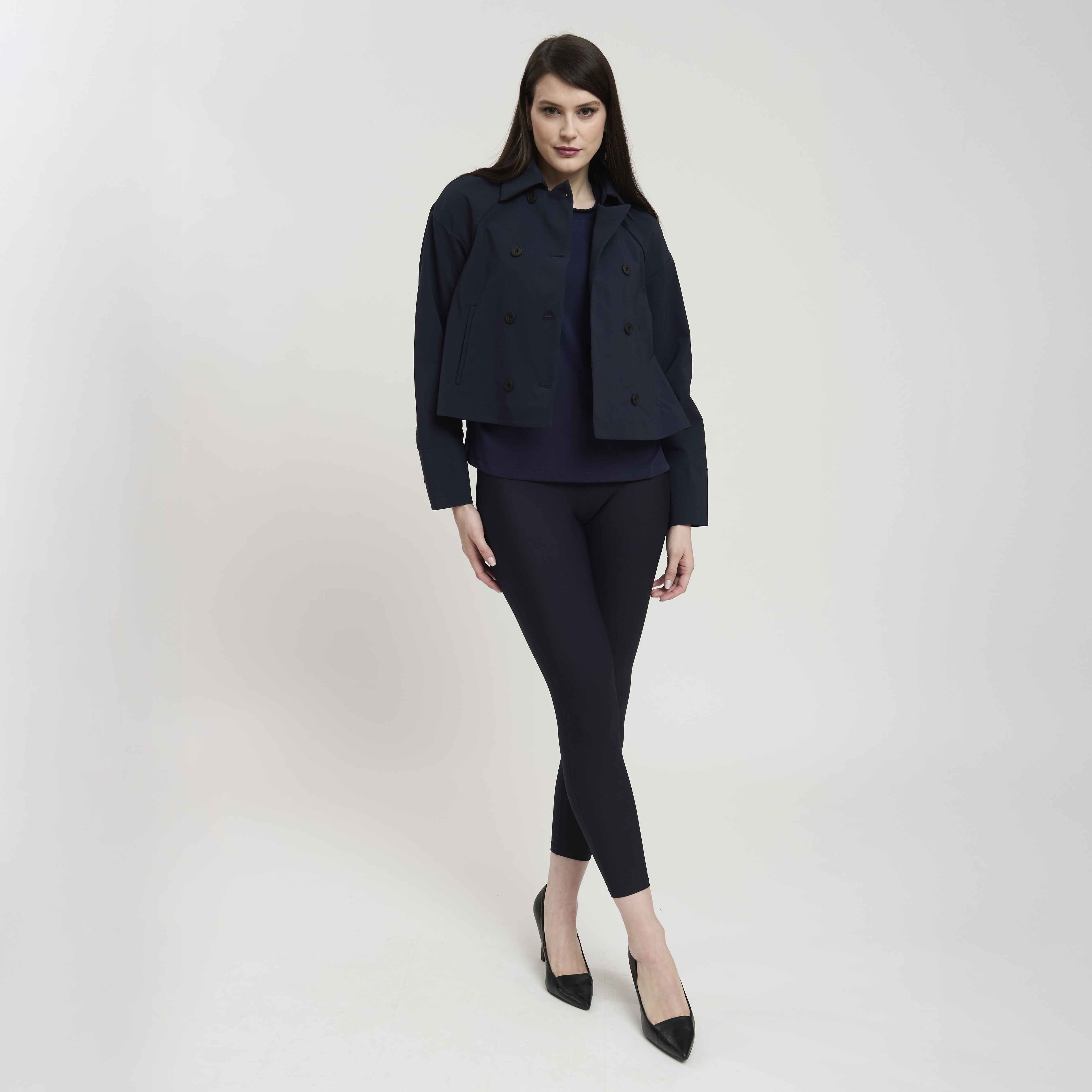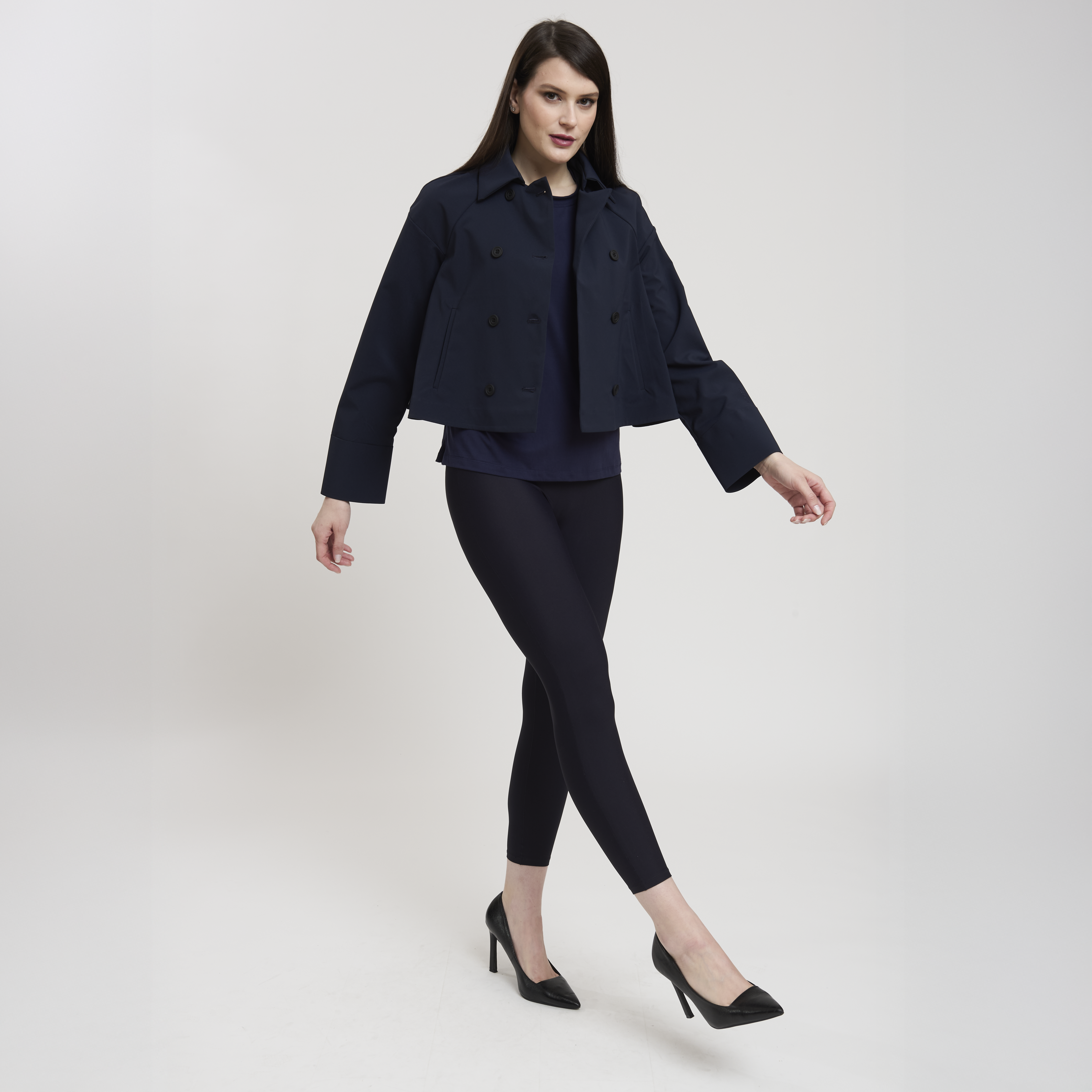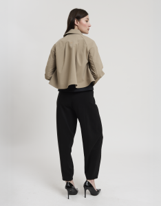 • Concept: Trench corto con collo a revers e maniche rifinite con polsino. Tasche sul davanti. Dettagli di pinces sul retro. Chiusura doppiopetto con bottoni gommati.