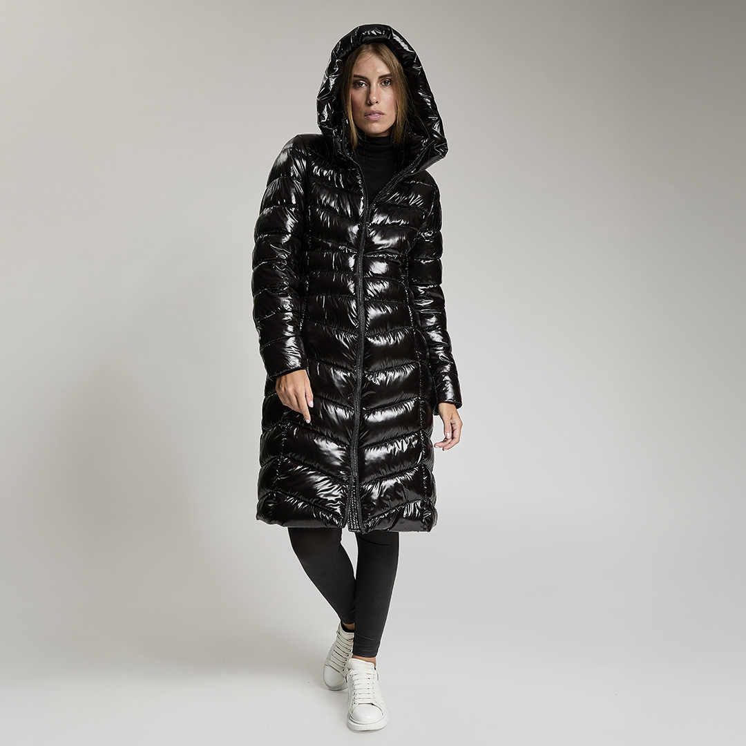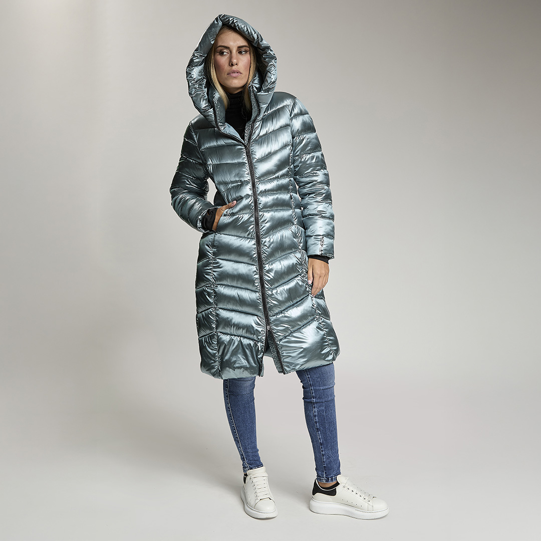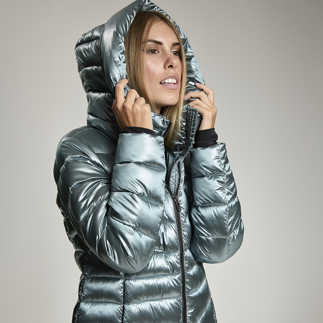 Giacca lunga imbottita e trapuntata con collo e cappuccio. Zip con doppio cursore “invisibile” che permette l'apertura dal fondo. Water repellent.