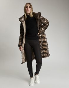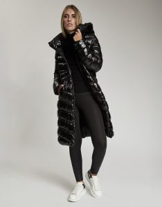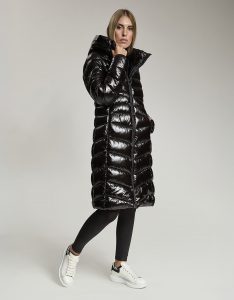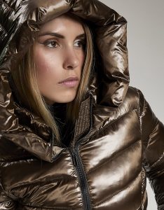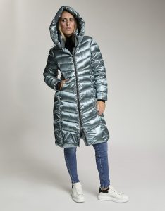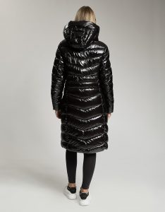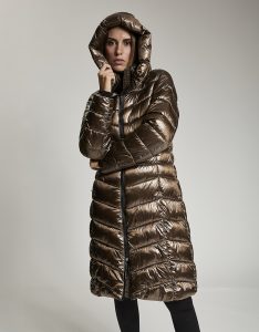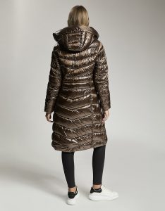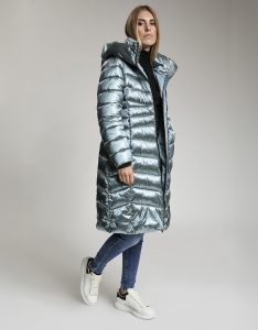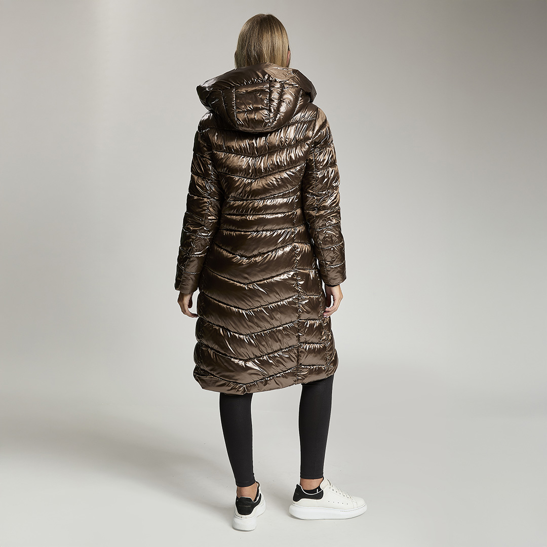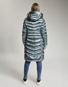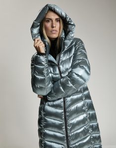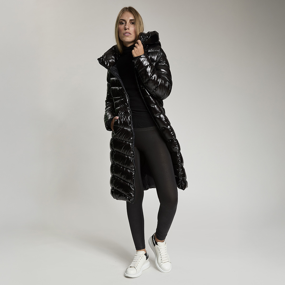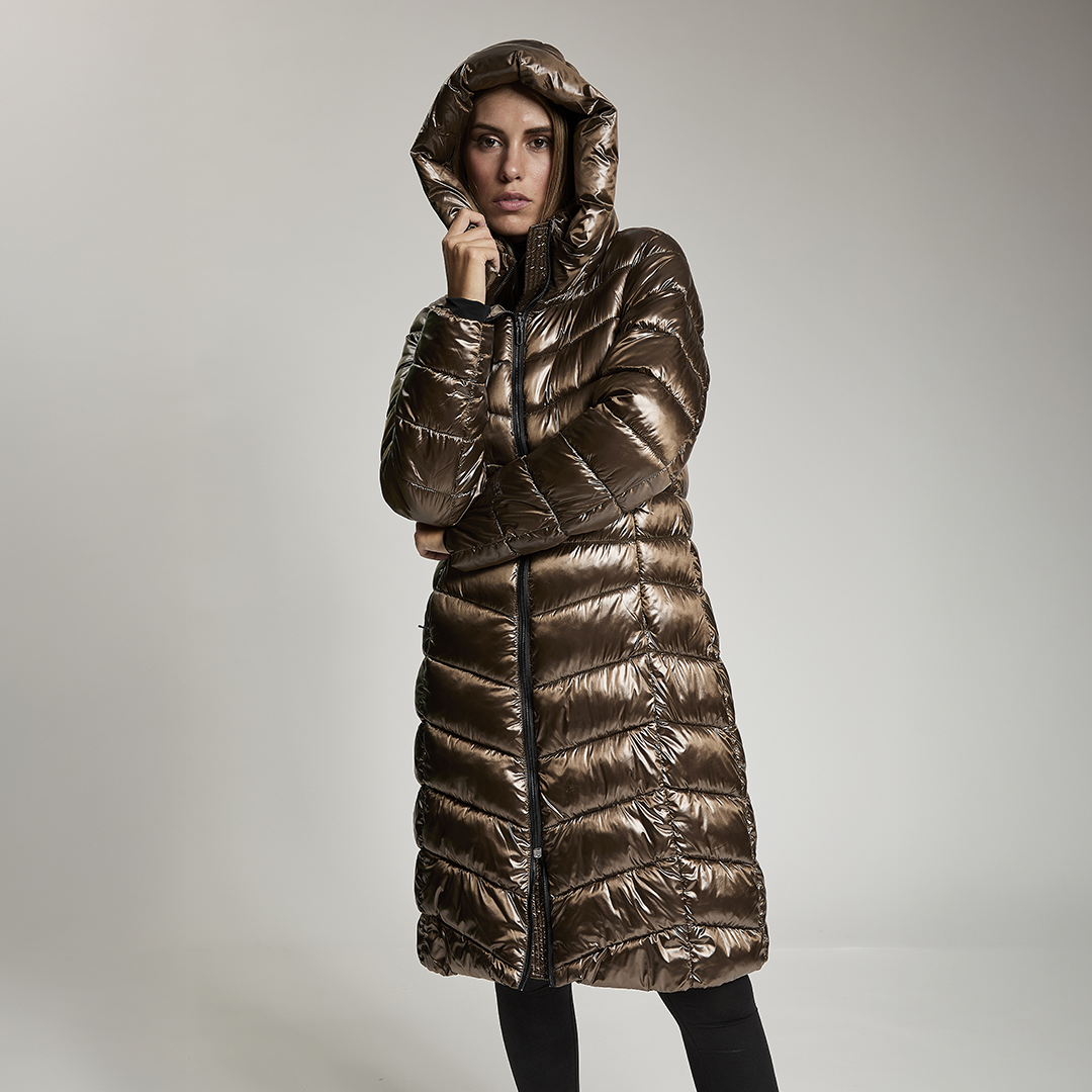 Giacca lunga imbottita e trapuntata con collo e cappuccio. Zip con doppio cursore “invisibile” che permette l'apertura dal fondo. Water repellent.